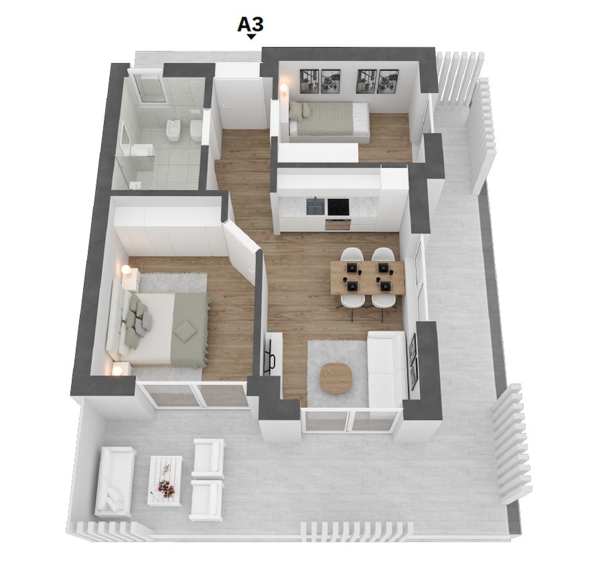 Wohnung A3: Zum Verkauf steht eine neue Dreizimmerwohnung mit Terrasse im 1. Stock. Interne Einteilung: Eingang, Wohnraum mit Küche, 2 Schlafzimmer, Badezimmer mit Fenster und Terrasse.