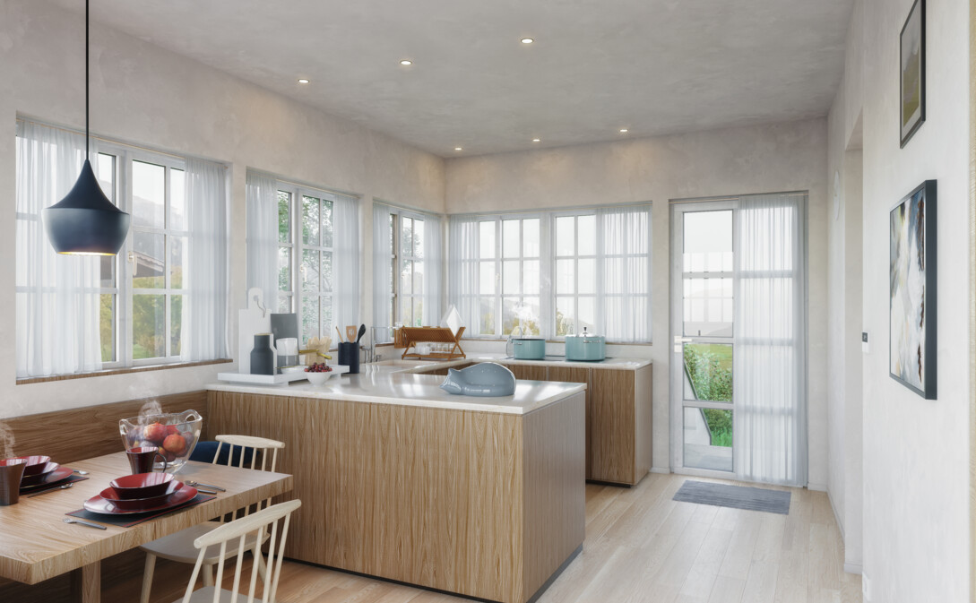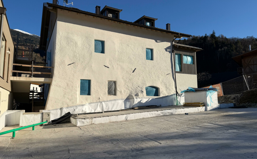 Die Fassadengestaltung (Textur-Körnung Verputz, helle Farbe, Materialien, usw.) wird in Absprache mit dem Denkmalamt vorgenommen. Es kommt ausschließlich Kalkputz zur Verwendung.