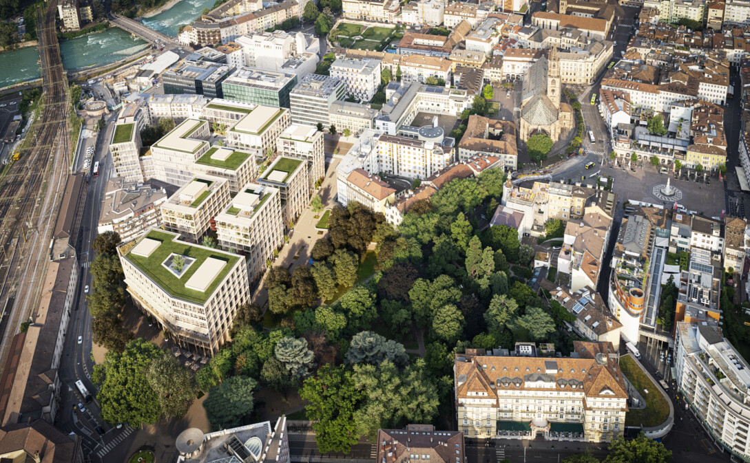 Der WaltherPark liegt im Herzen von Bozen. Im historischen Zentrum, zwischen Zugbahnhof und Waltherplatz, dem wichtigsten Platz der Stadt. Nahe dem Bozner Dom, der Universität und unmittelbar am neu gestalteten Bahnhofspark. Im Zuge der Requalifizierung des gesamten Quartiers wird der WaltherPark zu einem Anziehungspunkt für Besucher aus der Stadt selbst, aus der Region – und weit darüber hinaus.