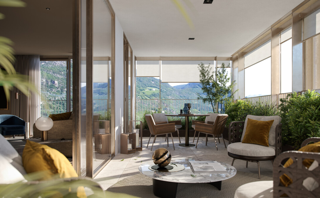 Ein Wohngebäude, das allen erdenklichen Bedürfnissen gerecht wird: Von kompakten Ein- oder Zweizimmerwohnungen bis hin zu großzügigen Apartments mit drei oder vier Zimmern. Fünf der Gebäude oberhalb des Shoppingcenters sind italienisch-eleganten Wohnungen gewidmet. Vom jeweils dritten bis siebten Obergeschoss warten flexible Einheiten auf ihre Besitzer, von der Singlewohnung über den Zweitwohnsitz bis zum Penthouse. Für ein Höchstmaß an Licht und Luft verfügt jede von ihnen über eine Loggia, Terrasse oder einen privaten Garten. Die bepflanzten Dachflächen im 3. Obergeschoss garantieren einen privaten und sicheren Zugang zu den Wohnungen umgeben von der Natur. Von hier kann der Blick schweifen: auf den Ritten, den Rosengarten und die Altstadt mit Waltherplatz und Bozner Dom.