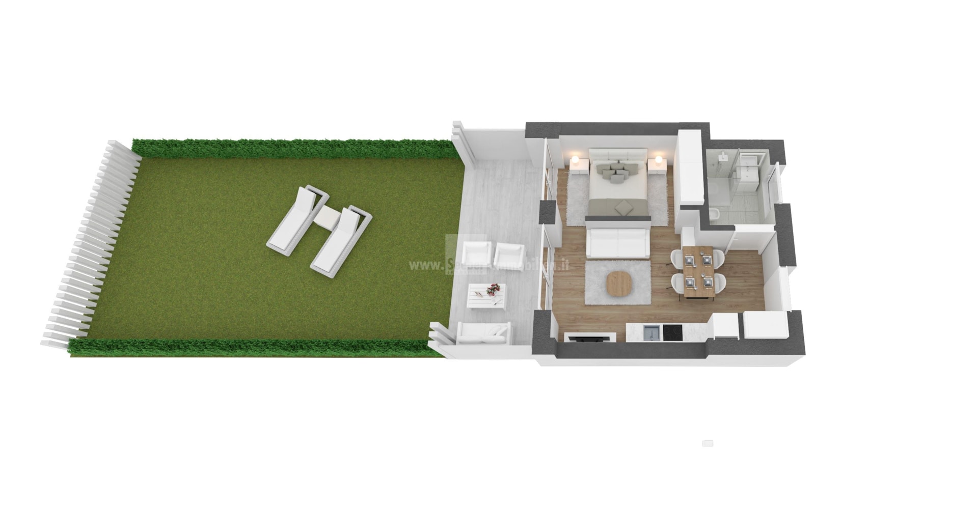 Wohnung B3: Zum Verkauf steht eine neue Einzimmerwohnung mit Terrasse und großem Privatgarten. Interne Einteilung: Eingang, Wohnraum mit Küche mit getrenntem Schlafzimmer, Badezimmer mit Fenster, Terrasse und Privatgarten.