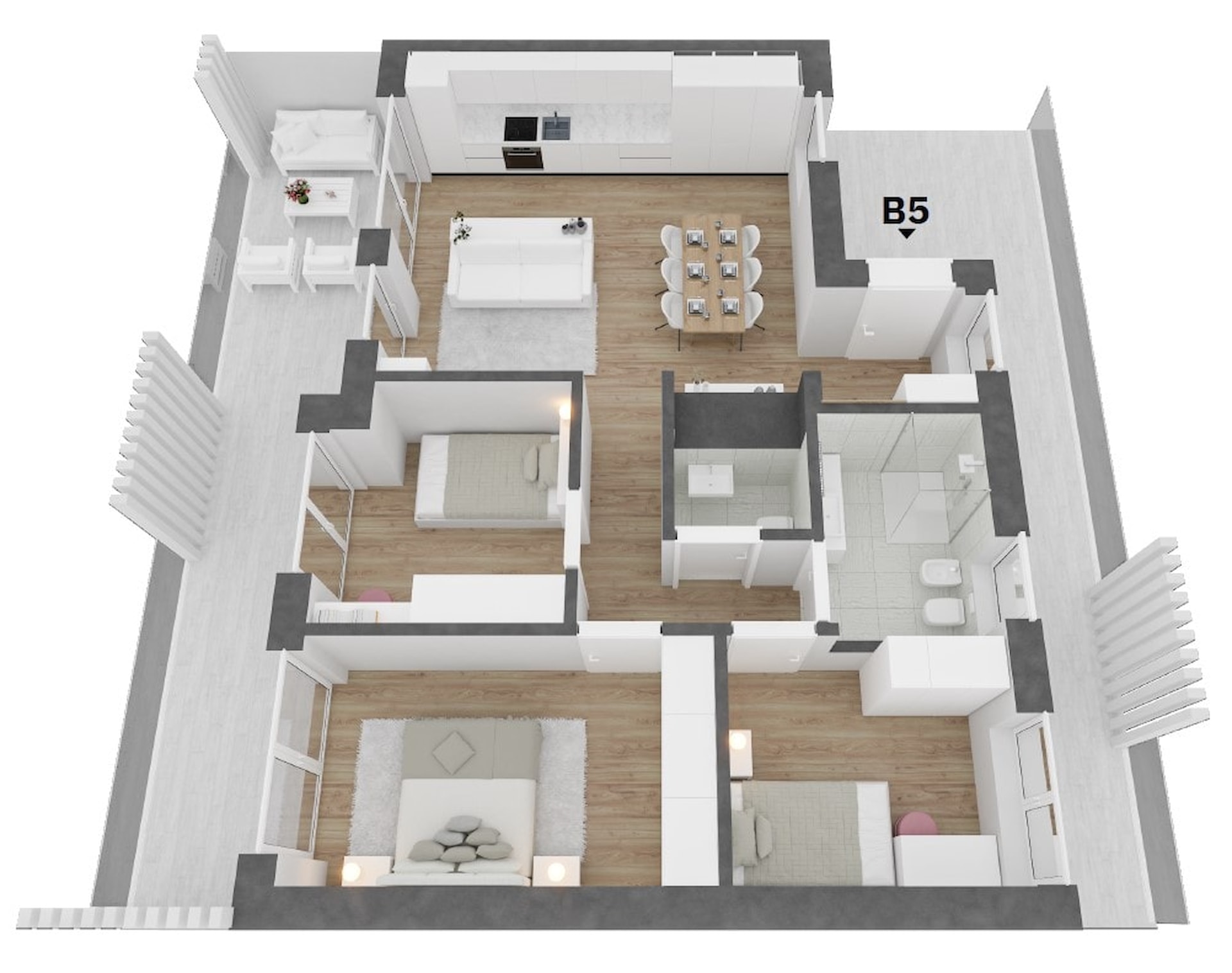 Wohnung B5: Zum Verkauf steht eine neue Vierzimmerwohnung mit großer Terrasse im 1. Stock. Interne Einteilung: Eingang, Wohnraum mit Küche, 3 Schlafzimmer, Badezimmer mit Fenster, Tages-WC und Terrasse.