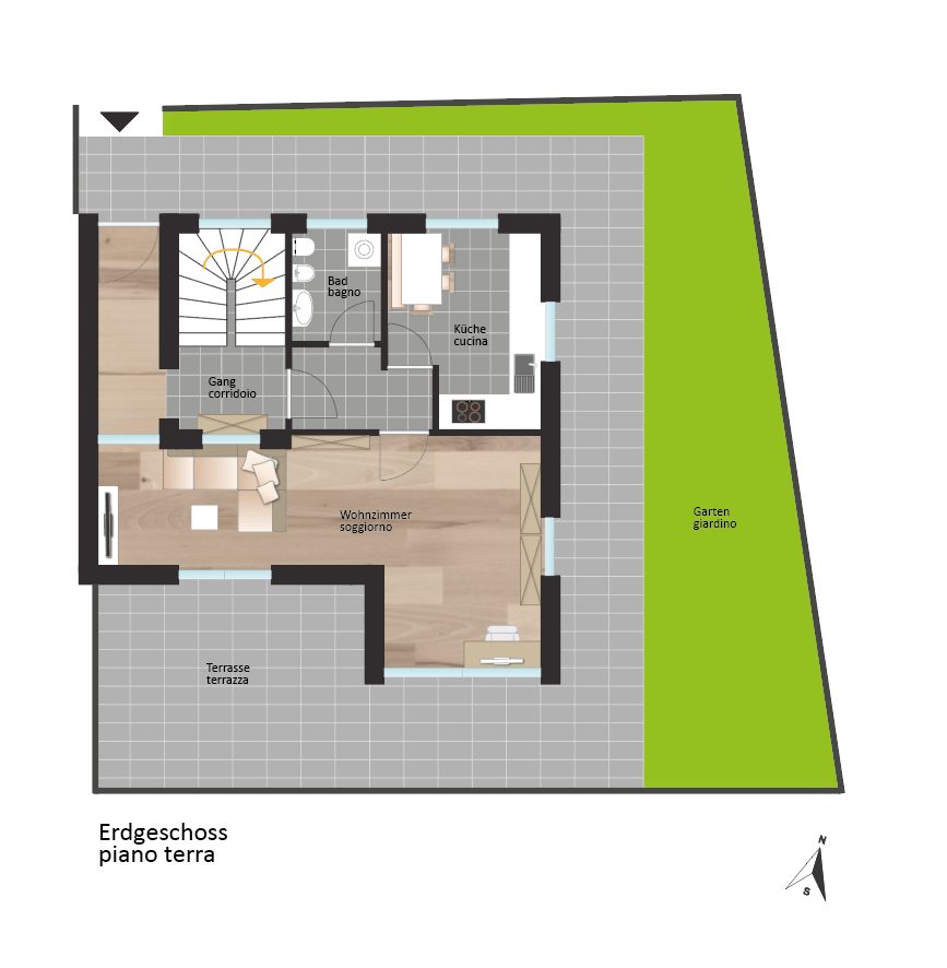 Im Erdgeschoss empfängt Sie ein freundlicher Eingangsbereich. Zudem befinden sich hier ein Badezimmer, eine separate Küche sowie ein großzügiger Wohnbereich mit direktem Zugang zur Terrasse und zum sonnigen Garten – perfekt für entspannte Stunden im Freien.