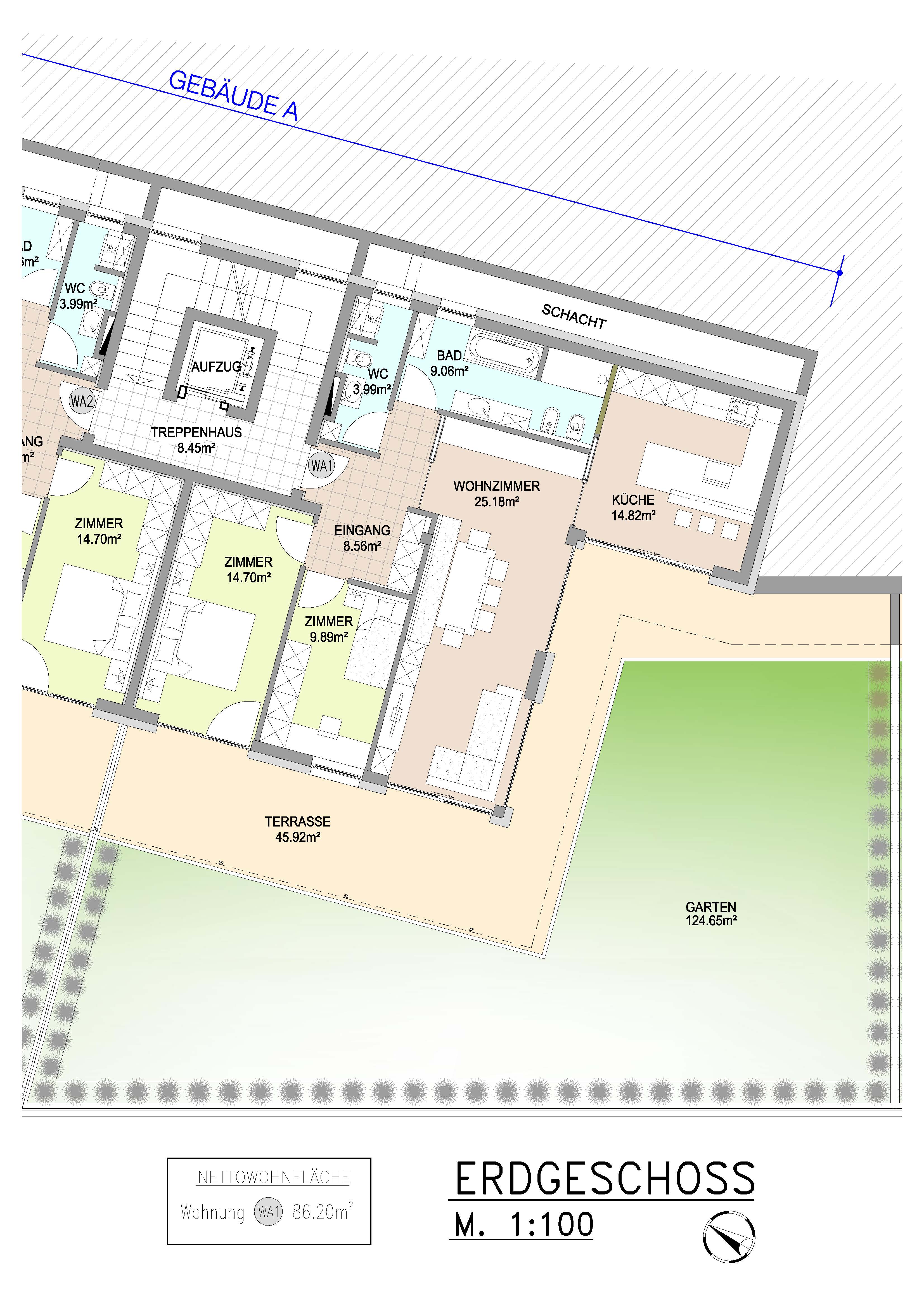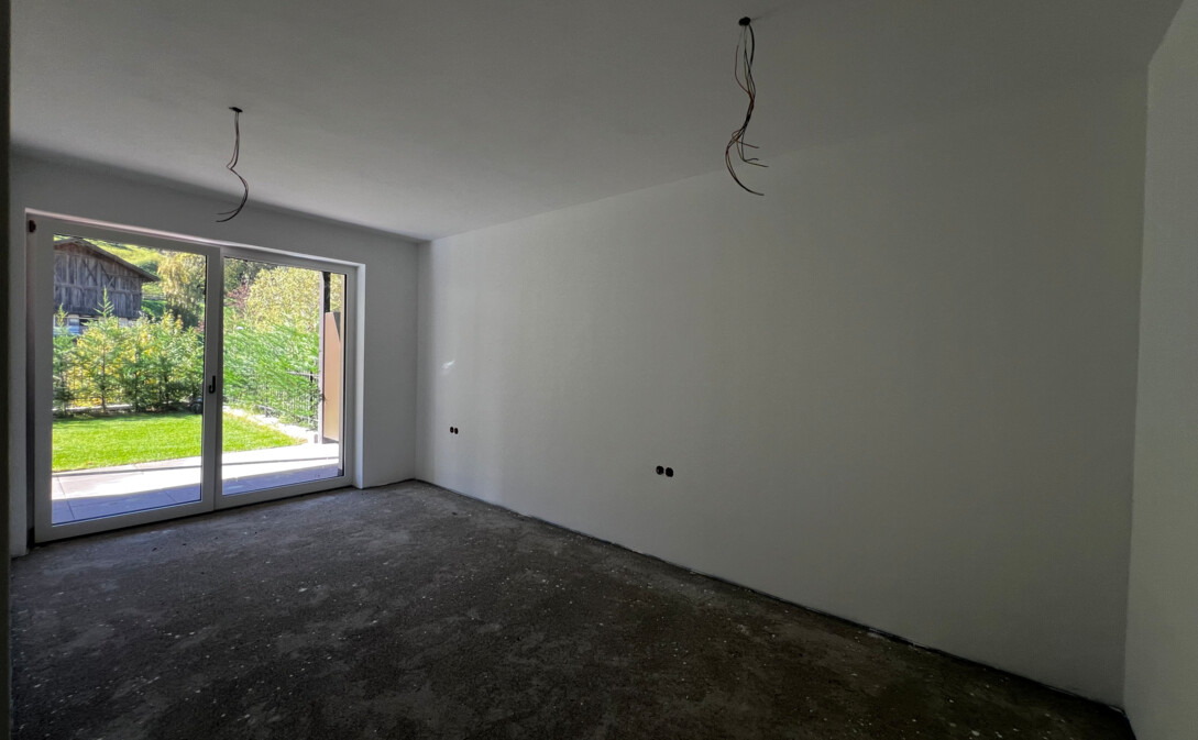 Diese Wohnung bietet durchdachten Wohnraum: ein einladender Eingangsbereich führen zum Wohn- und Essbereich, welcher offen mit der Küche gestaltet ist. Zwei geräumige Schlafzimmer und ein modernes Badezimmer vervollständigen die Raumaufteilung. Große Fensteröffnungen sorgen für viel Licht und freundliche Atmosphäre. Der Garten sowie eine private Terrassenfläche erlauben direkte Verbindung ins Freie und Natur.