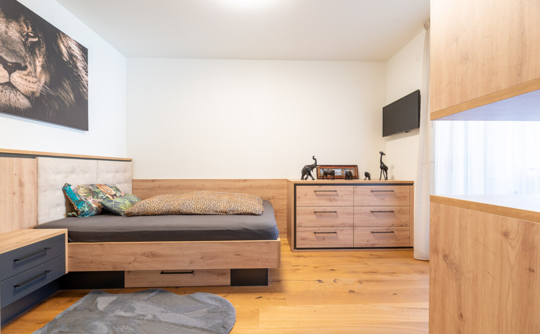 Die Wohnung eröffnet sich mit einem einladenden Eingangsbereich, der in den großzügigen Wohnraum mit integrierter Küche führt. Von hier aus gelangt man direkt auf eine der beiden Terrassen, die viel Licht und einen schönen Weitblick bieten. Drei Zimmer stehen zur Verfügung, wobei eines derzeit als komfortabler begehbarer Kleiderschrank genutzt wird. Das große Badezimmer verfügt über ein Fenster, zusätzlich gibt es ein separates Tages-WC. Zwei Terrassen erweitern den Wohnraum nach außen und bieten Platz für Entspannung im Freien.
