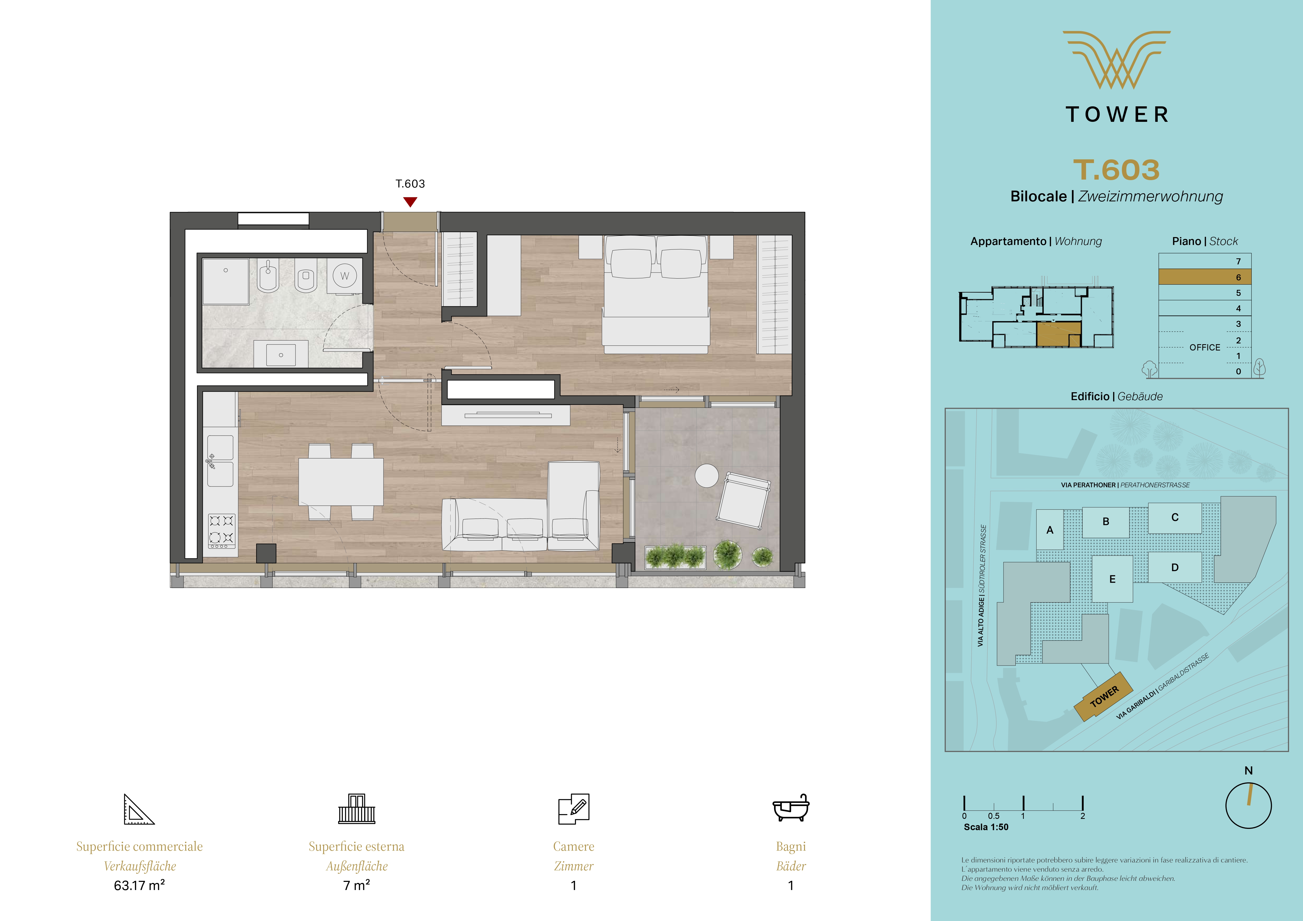 WOHNUNG T603 - WaltherPark Tower: Zum Verkauf steht eine neue, schöne Zweizimmerwohnung mit Terrasse im 6. OG - interne Einteilung wie folgt: Eingang, Wohnraum mit Küche, Schlafzimmer, Badezimmer und Terrasse.