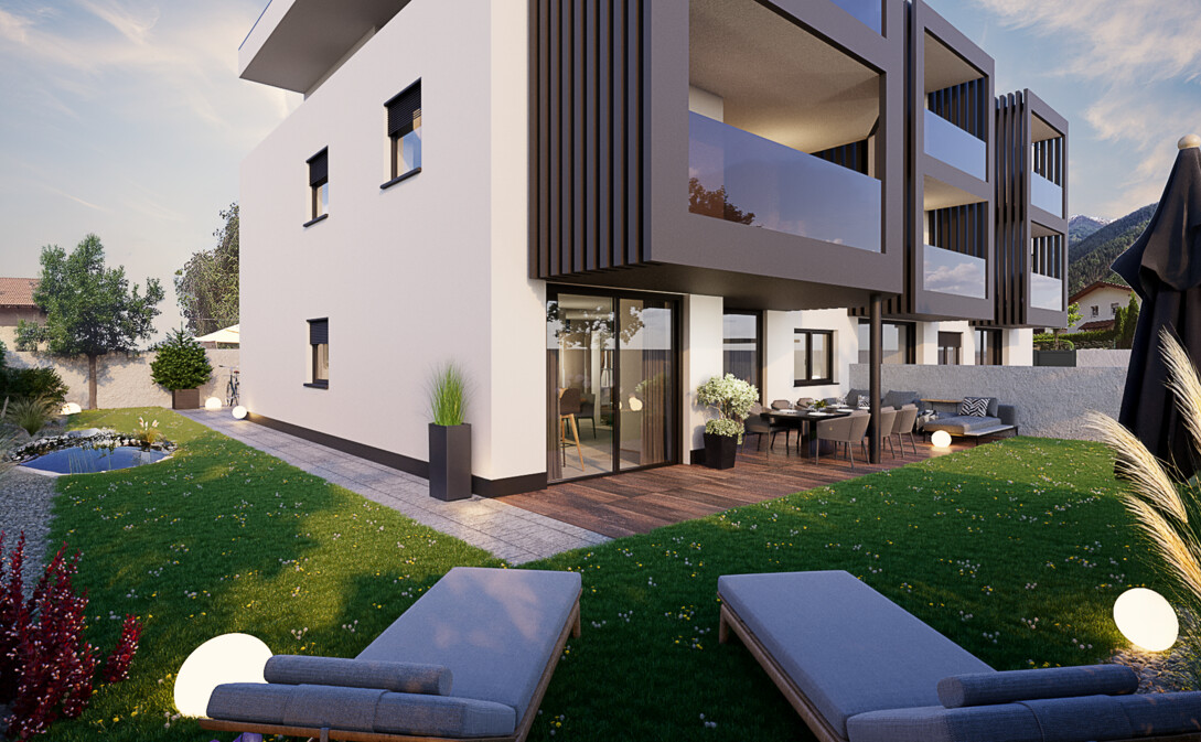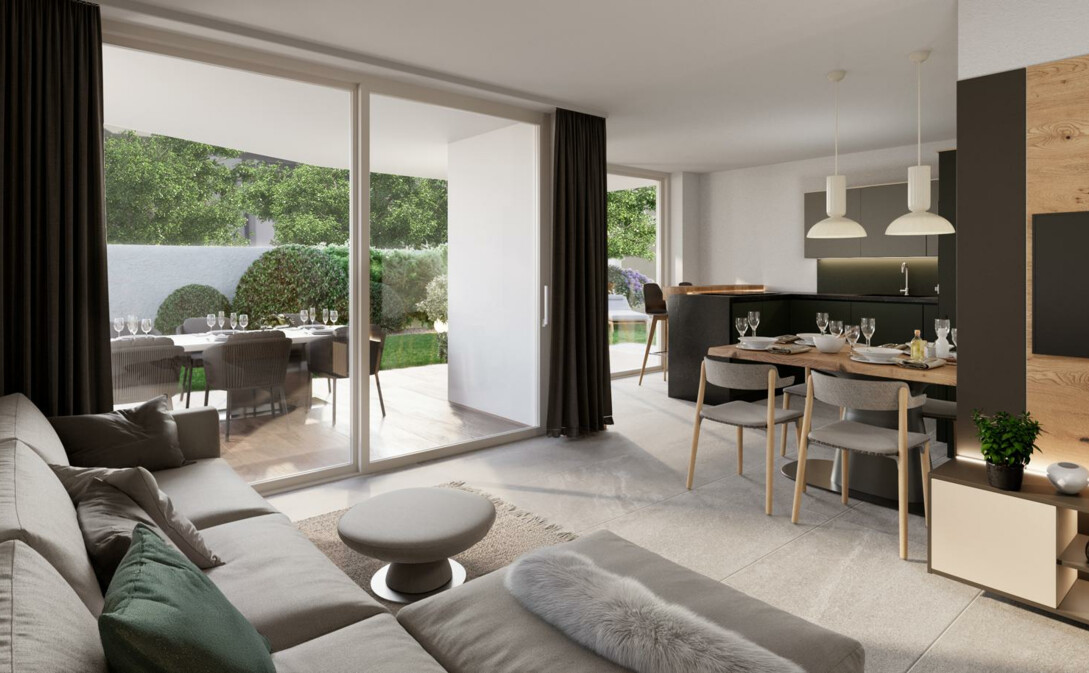 In dieser modernen und hochwertigen Wohnanlage steht eine großzügige Vierzimmerwohnung mit Terrasse und Privatgarten zum Verkauf – mit einer beeindruckenden Nettofläche von knapp 215 m².