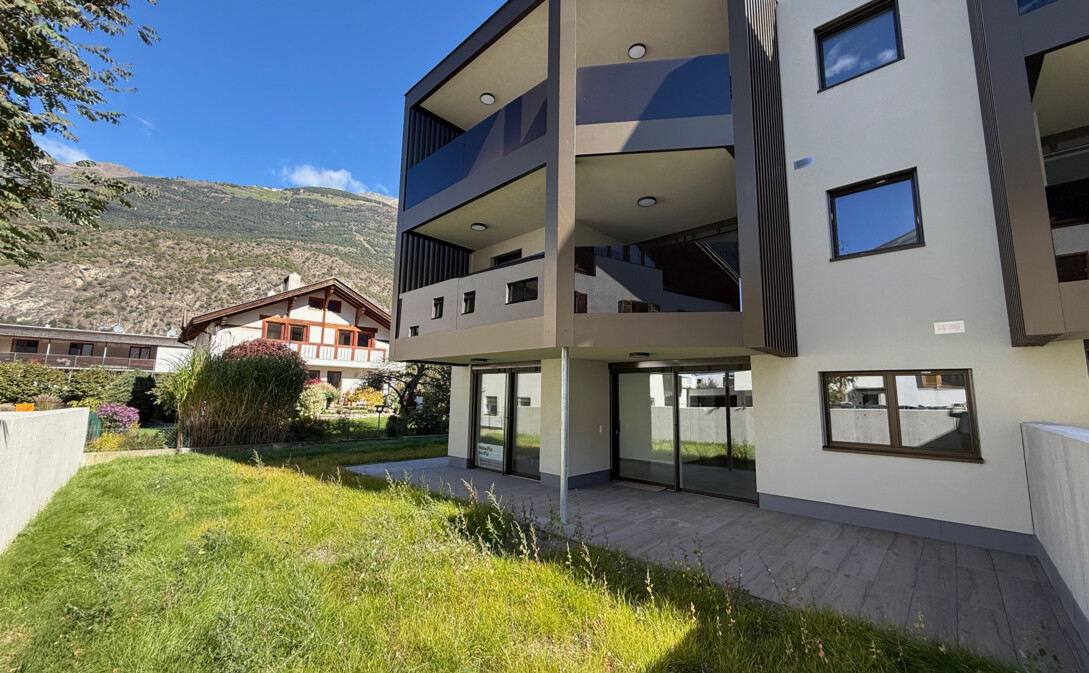 Interne Einteilung: Eingang, Wohnraum mit Küche, 3 Schlafzimmer, Badezimmer mit Fenster, Tages-WC, Terrasse und Privatgarten. Die Wohnung wird teilmöbliert, inklusive Küche, übergeben.