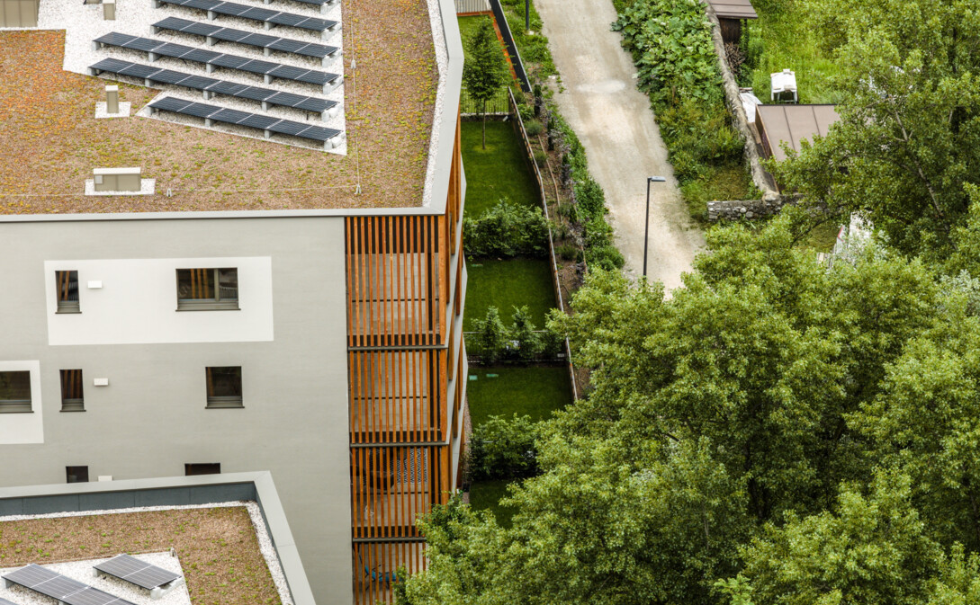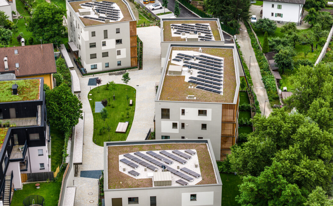 Die Wohnhäuser sind am Fernwärmenetz angeschlossen; die Gemeinschaftsflächen beziehen den Strom über eine Photovoltaikanlage.
