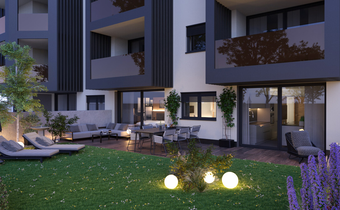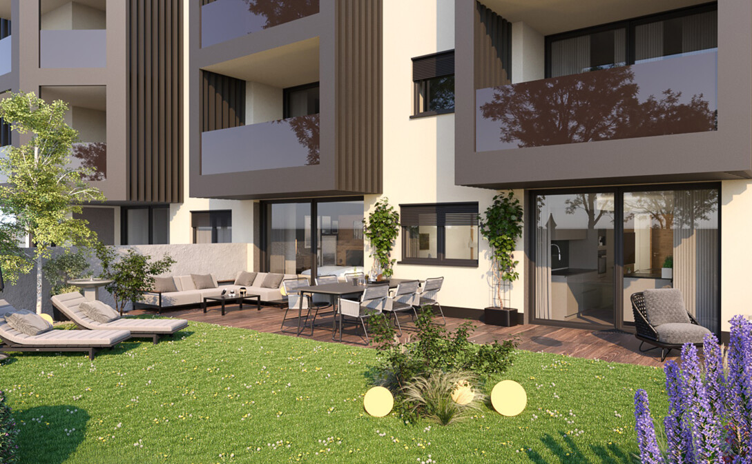 In dieser modernen und hochwertigen Wohnanlage steht eine großzügige Vierzimmerwohnung mit Terrasse und Privatgarten zum Verkauf – mit einer beeindruckenden Nettofläche von knapp 120 m².