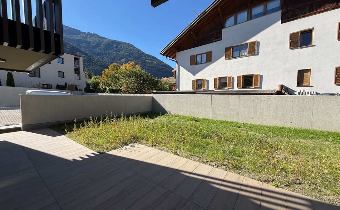 Interne Einteilung: Eingang, Wohnraum mit Küche, 3 Schlafzimmer, Badezimmer mit Fenster, Tages-WC, Terrasse und Privatgarten. Die Wohnung wird teilmöbliert, inklusive Küche, übergeben.