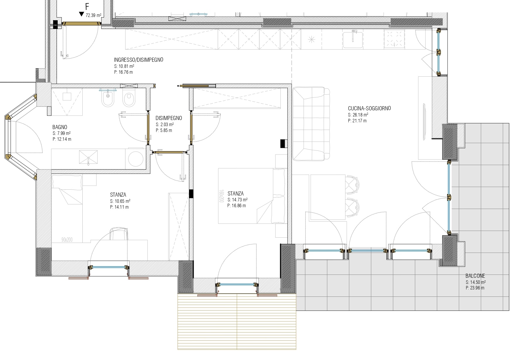 Interne Einteilung: Eingang, Wohnraum mit Küche, 2 Schlafzimmer, Badezimmer mit Fenster, Balkon und Balkon.