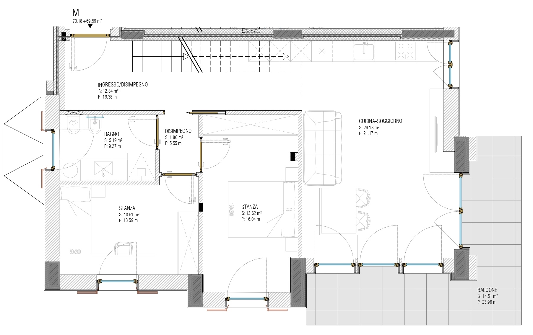 Interne Einteilung: Eingang, Wohnraum mit Küche, 2 Schlafzimmer, Badezimmer mit Fenster, Balkon und Dachboden.