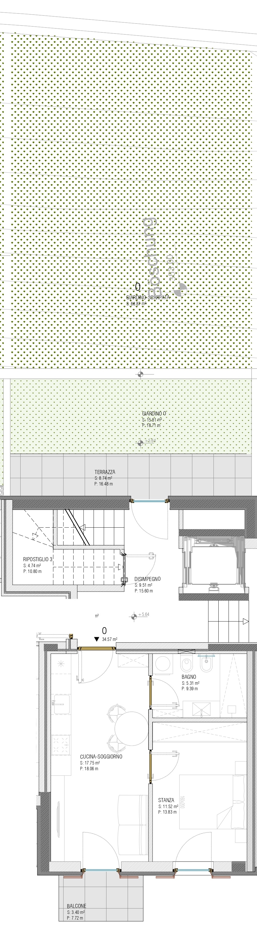 Interne Einteilung: Eingang, Wohnraum mit Küche, Schlafzimmer, Badezimmer, Balkon und Privatgarten.