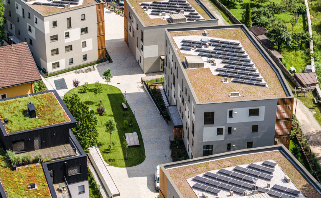 Die Wohnhäuser sind am Fernwärmenetz angeschlossen; die Gemeinschaftsflächen beziehen den Strom über eine Photovoltaikanlage.