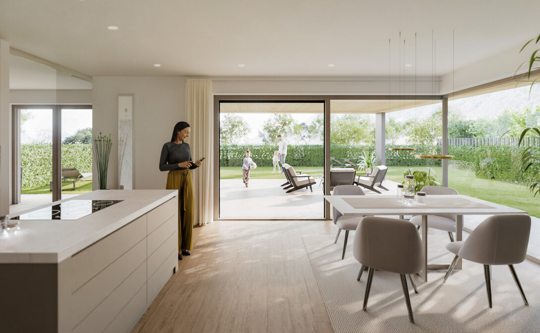 Diese großzügige 5-Zimmer-Gartenwohnung im Erdgeschoss (Wohnung 2+3) überzeugt durch ein modernes Raumkonzept, viel Tageslicht und einen großen privaten Außenbereich. Der offene Wohn- und Essbereich mit Küche führt direkt auf die großzügige Terrasse und in den privaten Garten.