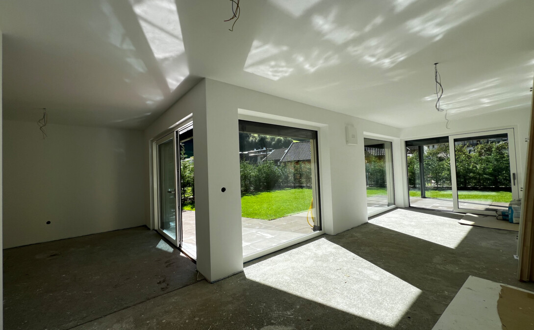 Diese Wohnung bietet durchdachten Wohnraum: ein einladender Eingangsbereich führen zum Wohn- und Essbereich, welcher offen mit der Küche gestaltet ist. Zwei geräumige Schlafzimmer und ein modernes Badezimmer vervollständigen die Raumaufteilung. Große Fensteröffnungen sorgen für viel Licht und freundliche Atmosphäre. Der Garten sowie eine private Terrassenfläche erlauben direkte Verbindung ins Freie und Natur.