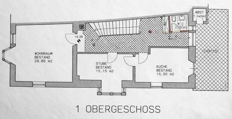 - 1. Obergeschoss: Repräsentativer Eingangsbereich, Küche, traditionelle Stube mit originaler Holzvertäfelung, Wohnzimmer sowie eine gemütliche, ruhig gelegene Terrasse.
