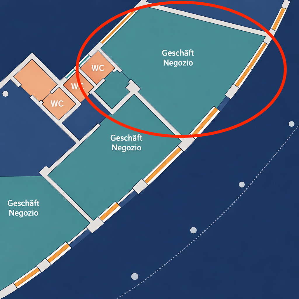 Die Lage überzeugt durch ihre sehr gute Sichtbarkeit sowie die starke Frequenz – sowohl durch Fußgänger als auch durch den Verkehr. Die zentrale Position in einem gewachsenen Stadtviertel mit umliegenden Büros, Dienstleistungsbetrieben und Wohnhäusern macht das Objekt besonders attraktiv.
