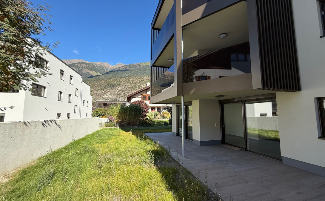Interne Einteilung: Eingang, Wohnraum mit Küche, 3 Schlafzimmer, Badezimmer mit Fenster, Tages-WC, Terrasse und Privatgarten. Die Wohnung wird teilmöbliert, inklusive Küche, übergeben.