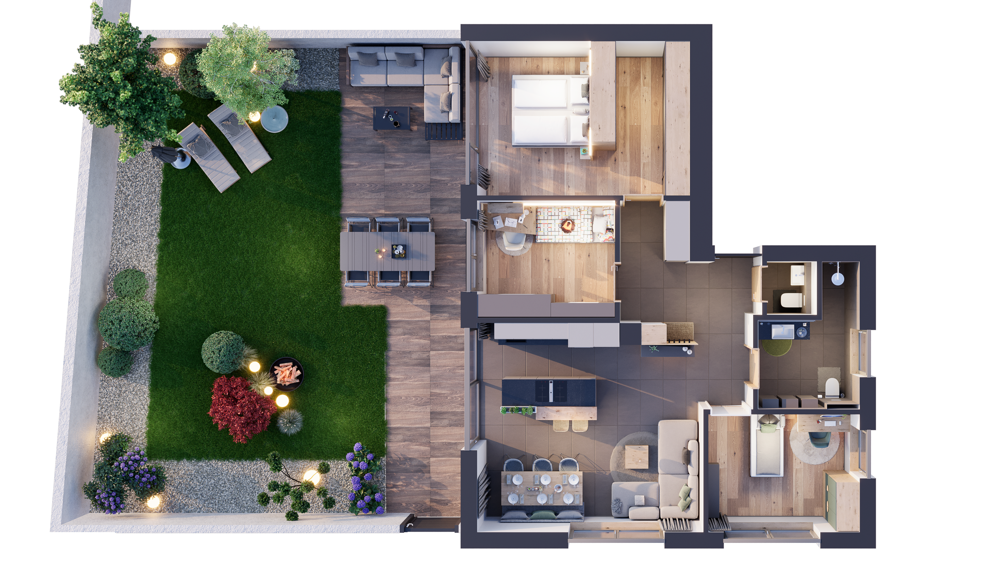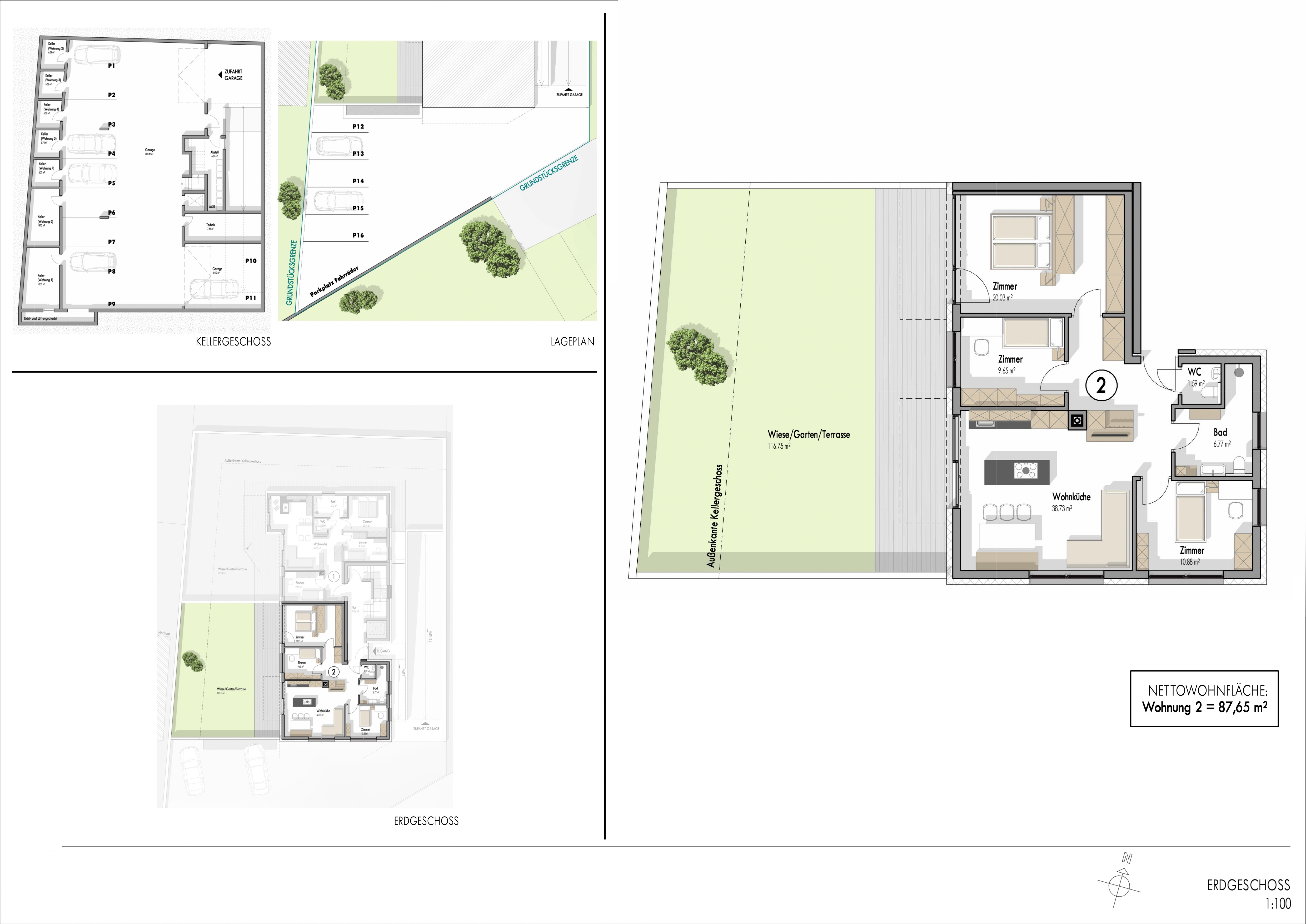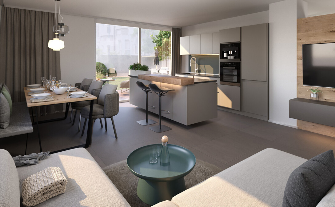 In dieser modernen und hochwertigen Wohnanlage steht eine großzügige Vierzimmerwohnung mit Terrasse und Privatgarten zum Verkauf – mit einer beeindruckenden Nettofläche von knapp 120 m².