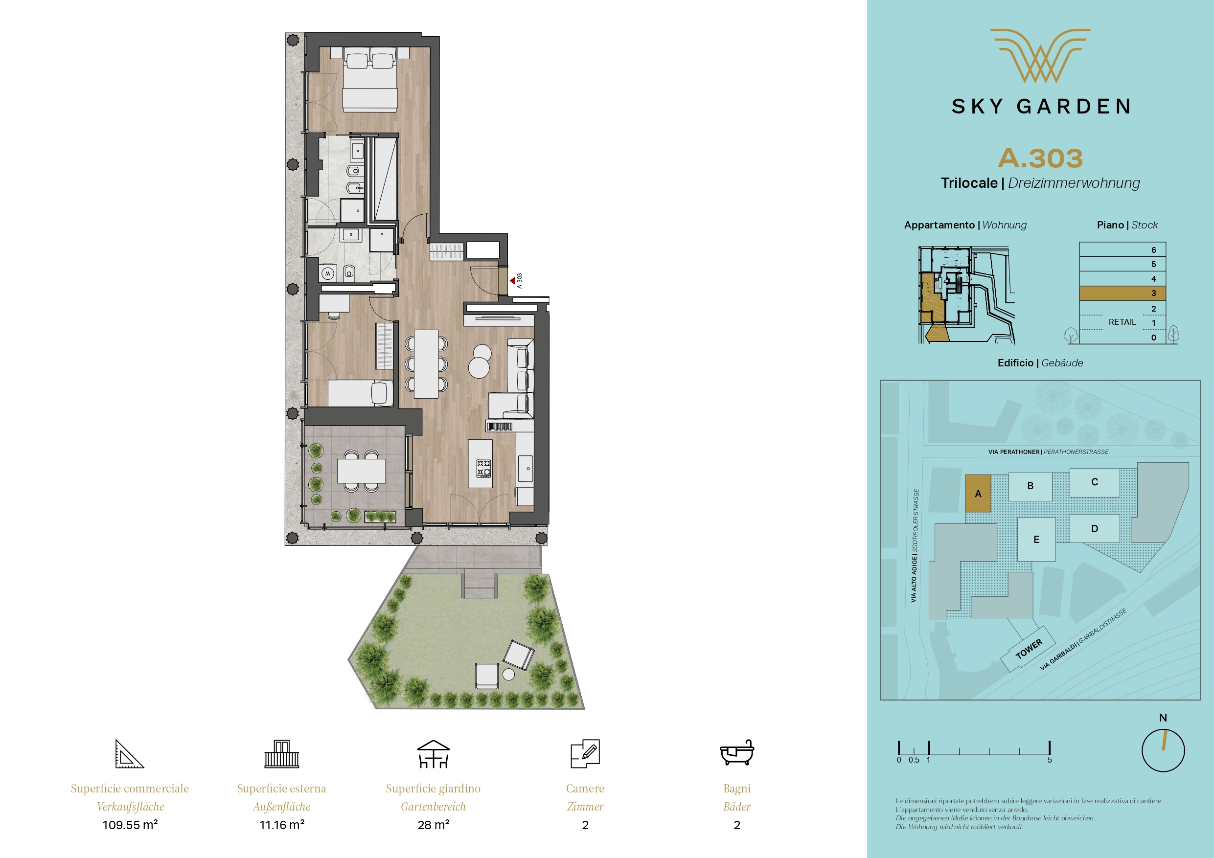 APPARTAMENTO A303 - Syk Garden A: Proponiamo in vendita nuovo trilocale luminoso con terrazza e giardino privato al terzo piano - disposizione interna quanto segue: ingresso, soggiorno con cucina, 2 camere da letto, 2 bagni finestrati, terrazza e giardino privato.