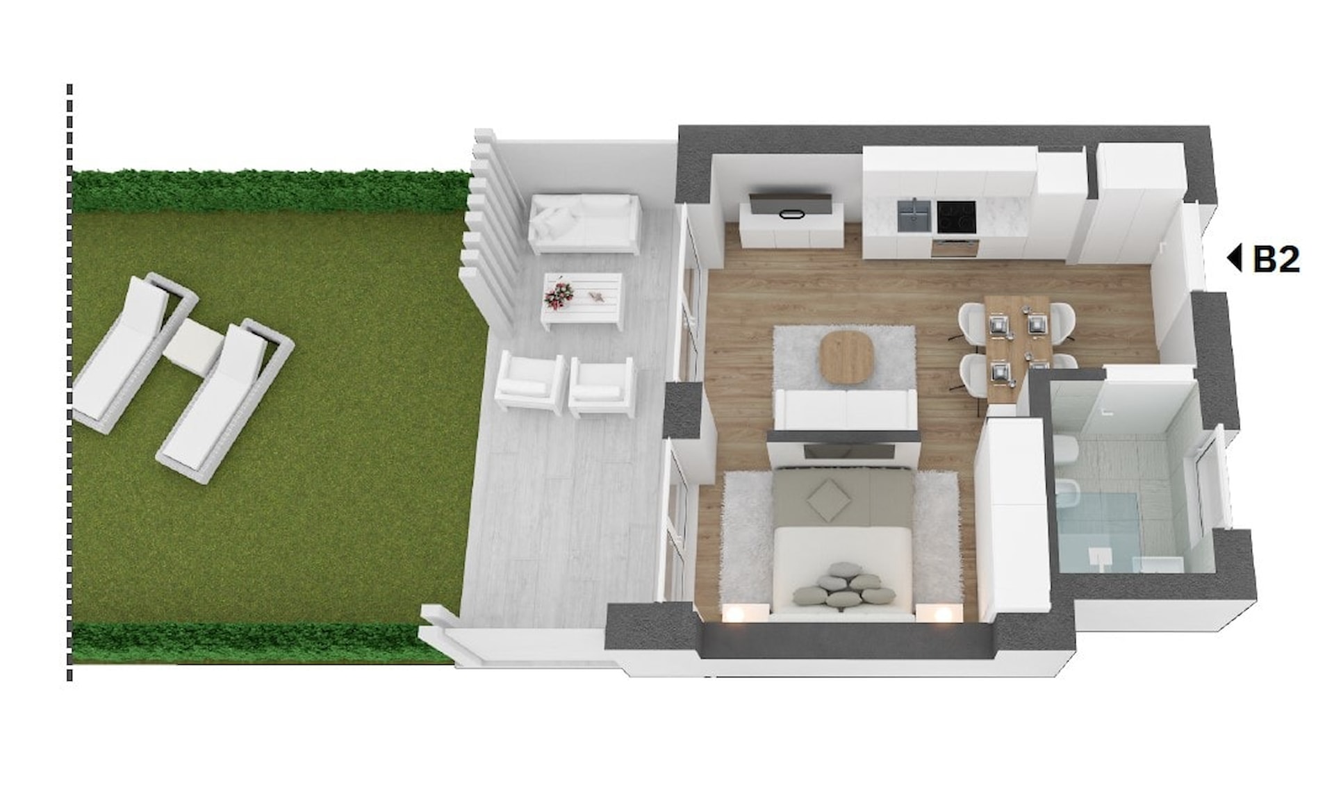 Appartamento B2: Proponiamo in vendita un nuovo monolocale con terrazza e giardino privato. Distribuzione interna: ingresso, soggiorno con cucina con camere da letto separata, bagno con finestra, terrazza e giardino privato.