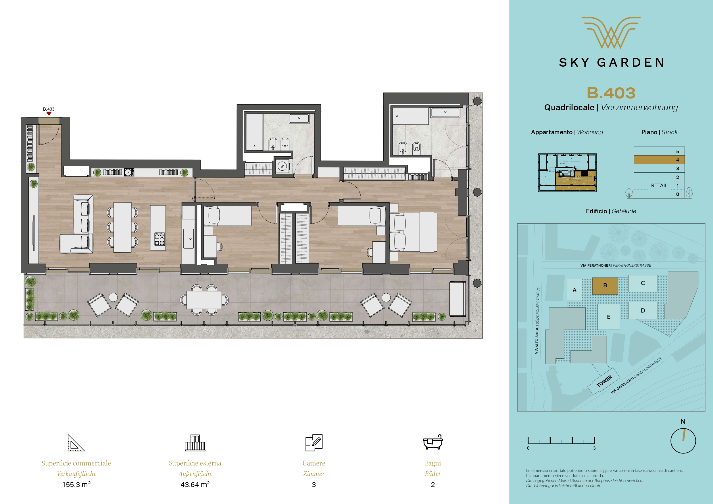 APPARTAMENTO B403 - Syk Garden B: Proponiamo in vendita nuovo, ampio quadrilocale con terrazza al quarto piano - disposizione interna quanto segue: ingresso, soggiorno con cucina, 3 stanze da letto, 2 bagni, terrazza e giardino privato.