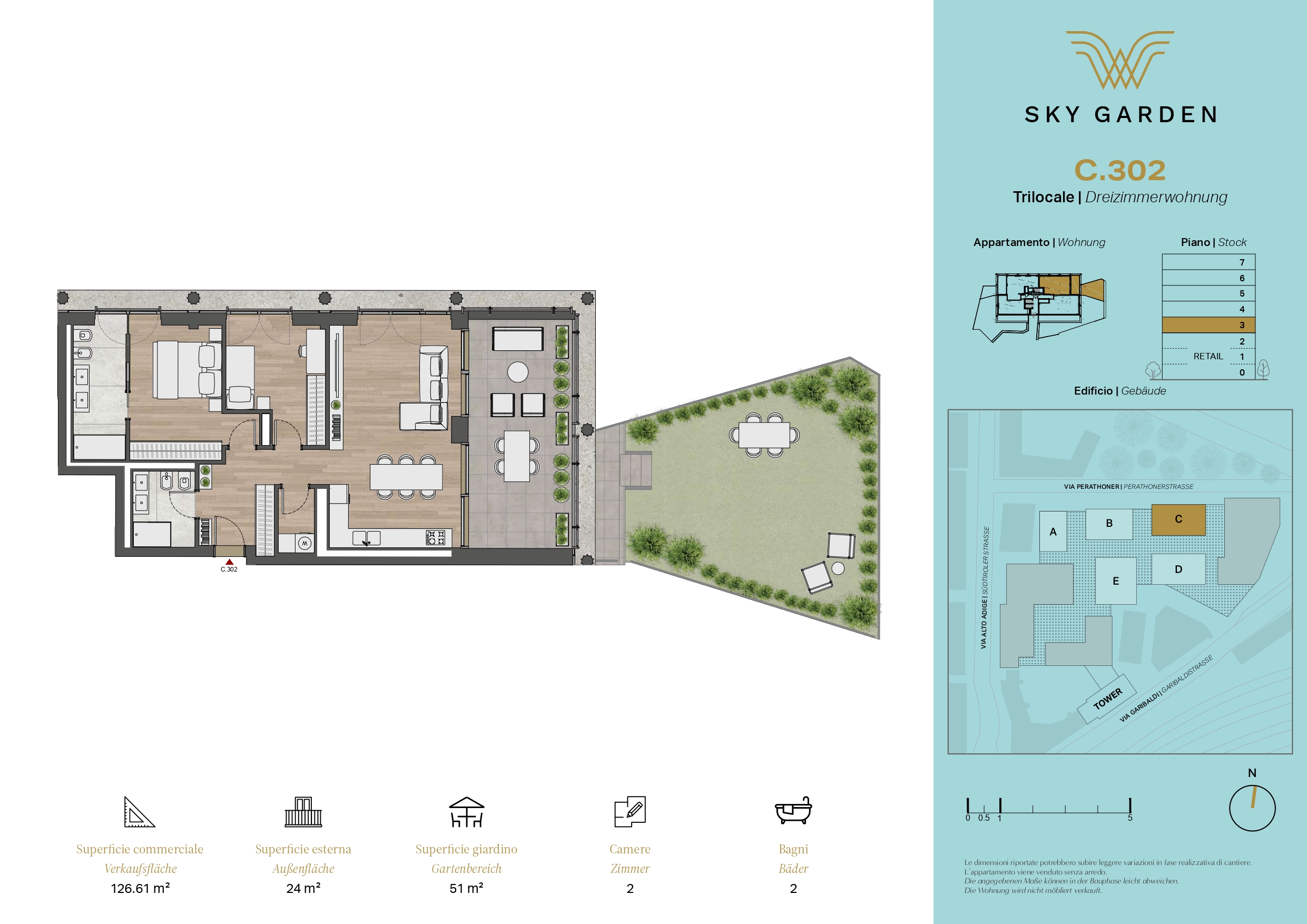 APPARTAMENTO C302 - Syk Garden C: Proponiamo in vendita nuovo, ampio trilocale con giardino privato al terzo piano - disposizione interna quanto segue: ingresso, soggiorno con cucina, 2 stanze da letto, 2 bagni (di cui uno finestrato), terrazza e giardino privato.