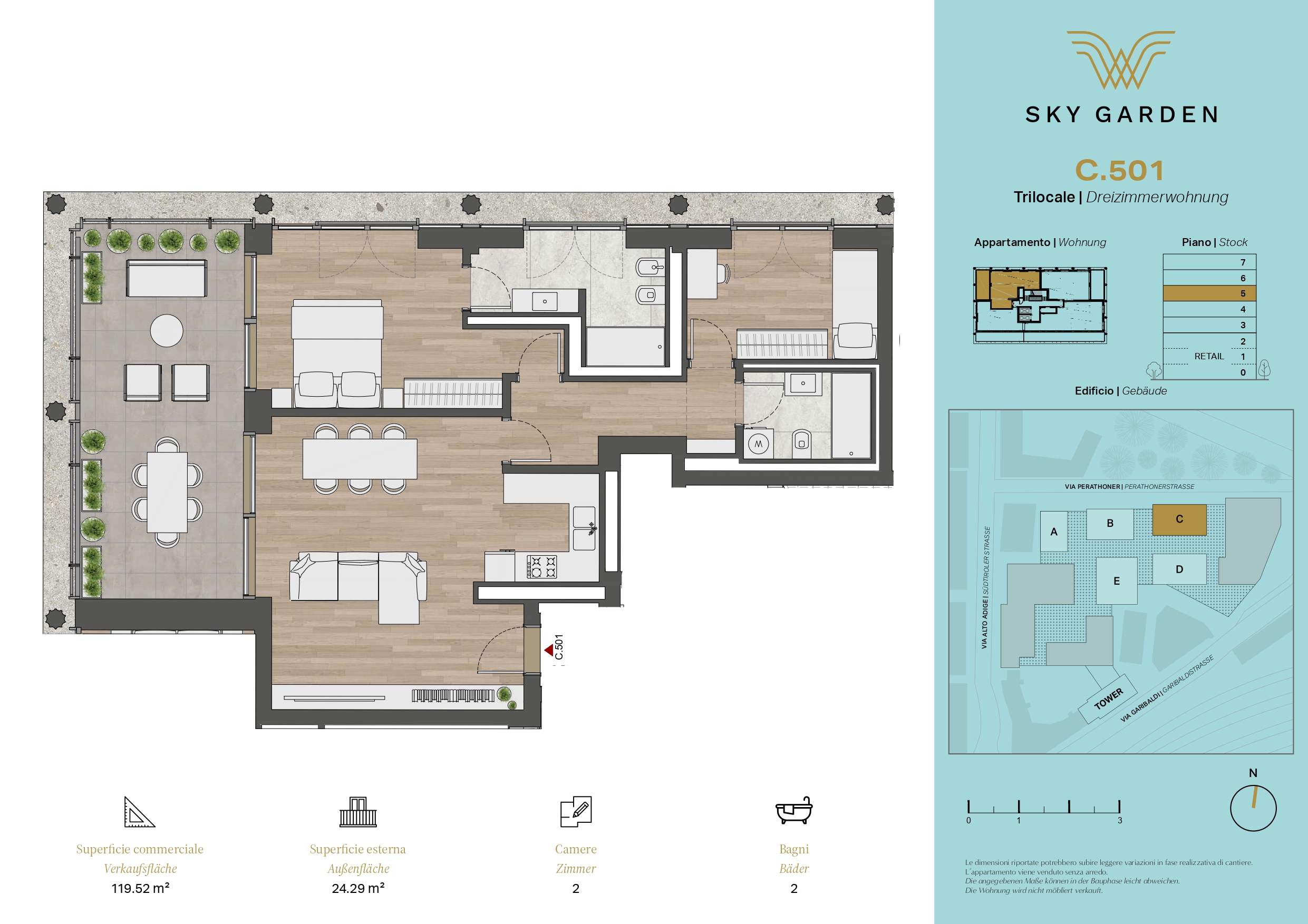 APPARTAMENTO C501 - Syk Garden C: Proponiamo in vendita nuovo, ampio trilocale con terrazza al quinto piano - disposizione interna quanto segue: ingresso, soggiorno con cucina, 2 stanze da letto, 2 bagni (di cui uno finestrato) e terrazza.