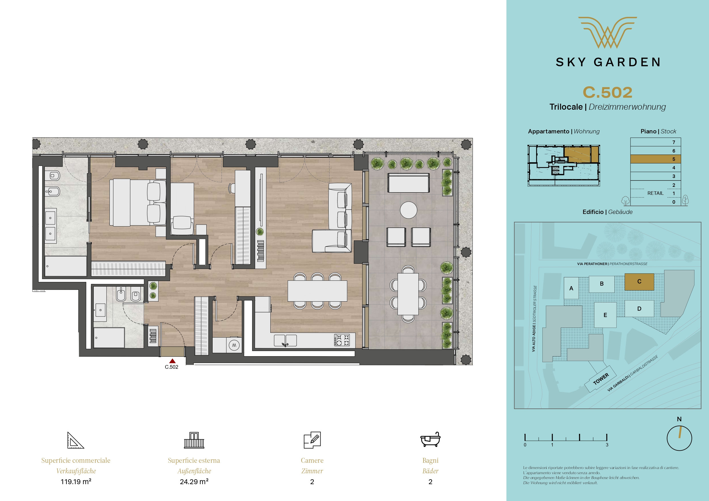 APPARTAMENTO C502 - Syk Garden C: Proponiamo in vendita nuovo, ampio trilocale con terrazza e vista parco al quinto piano - disposizione interna quanto segue: ingresso, soggiorno con cucina, 2 stanze da letto, 2 bagni (di cui uno finestrato) e terrazza.
