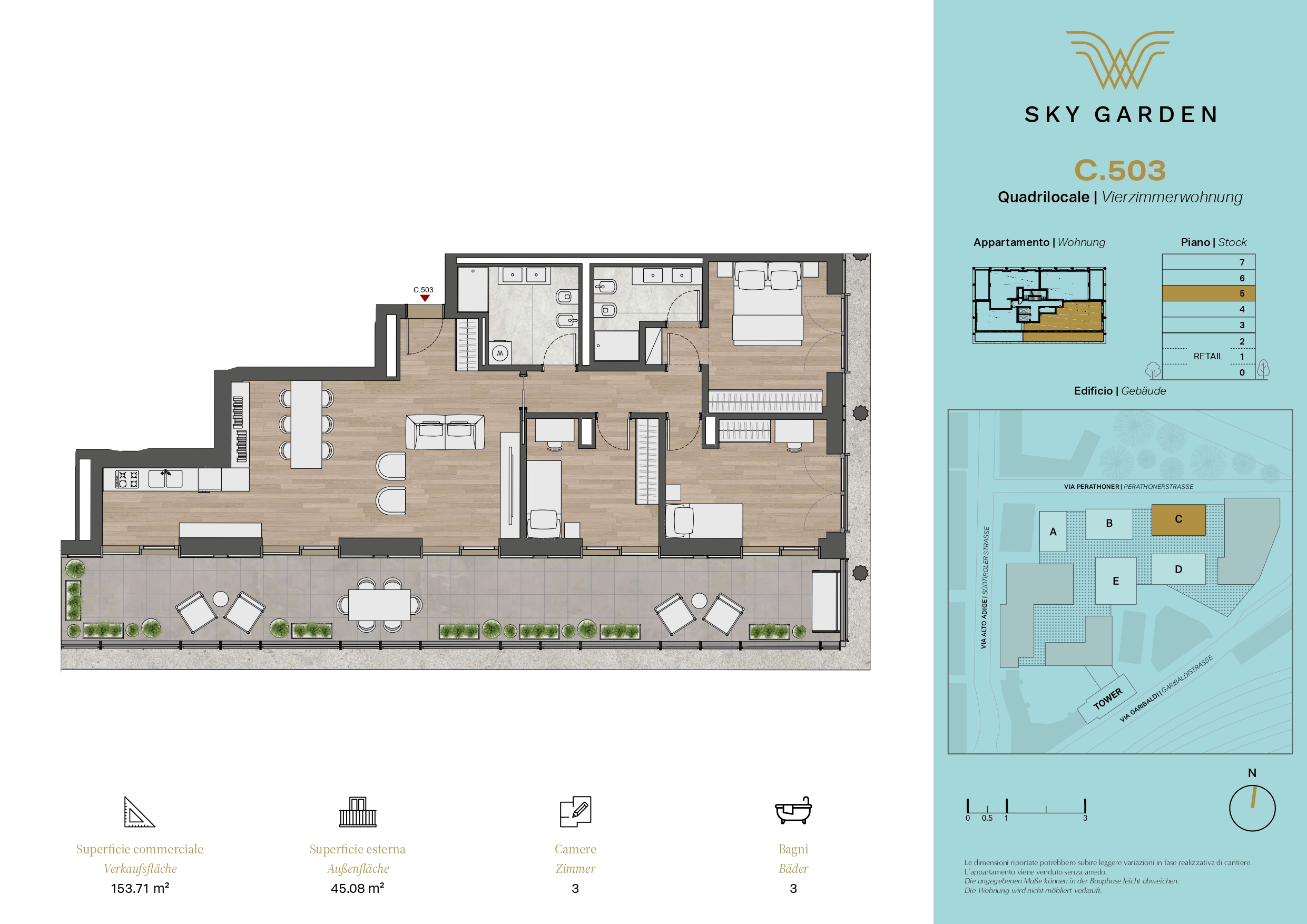 APPARTAMENTO C503 - Sykgarden C: Proponiamo in vendita nuovo quadrilocale con ampia terrazza al quinto piano - disposizione interna quanto segue: ingresso, soggiorno con cucina, 3 stanze da letto (di cui una con bagno padronale), bagno, WC e terrazza.