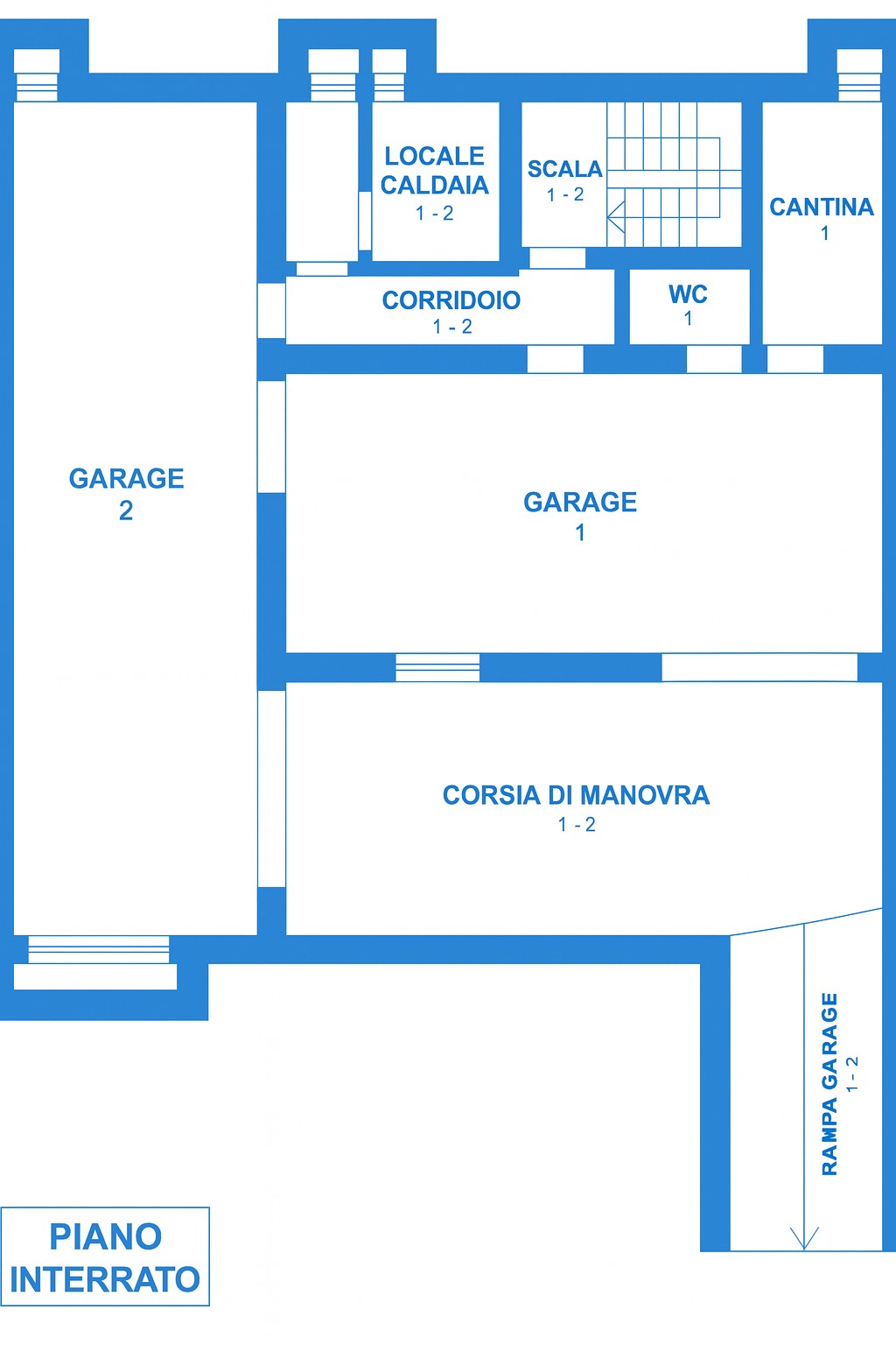 Seminterrato: due garage doppi e due cantine; uno dei garage è dotato di WC.