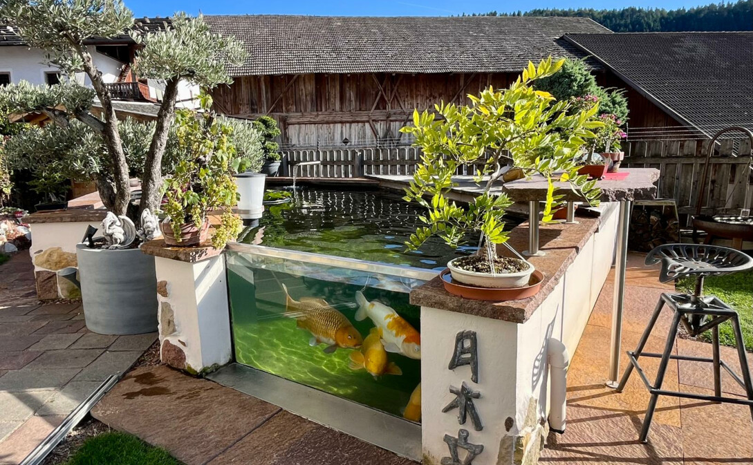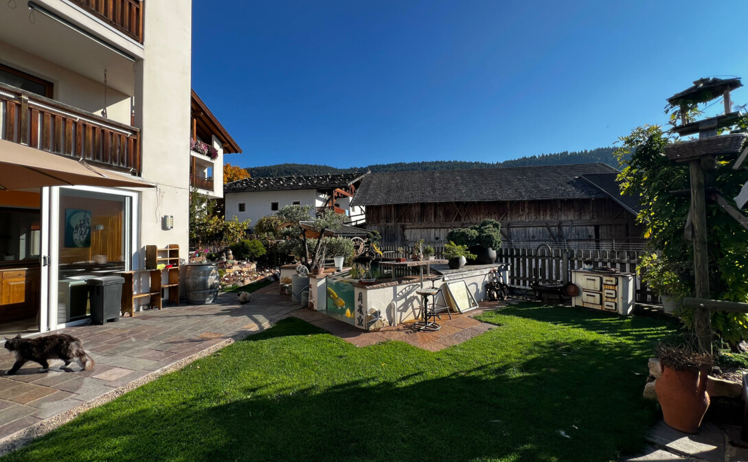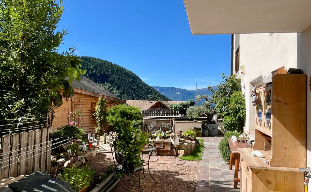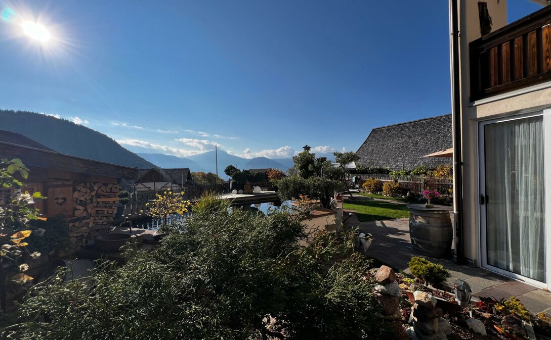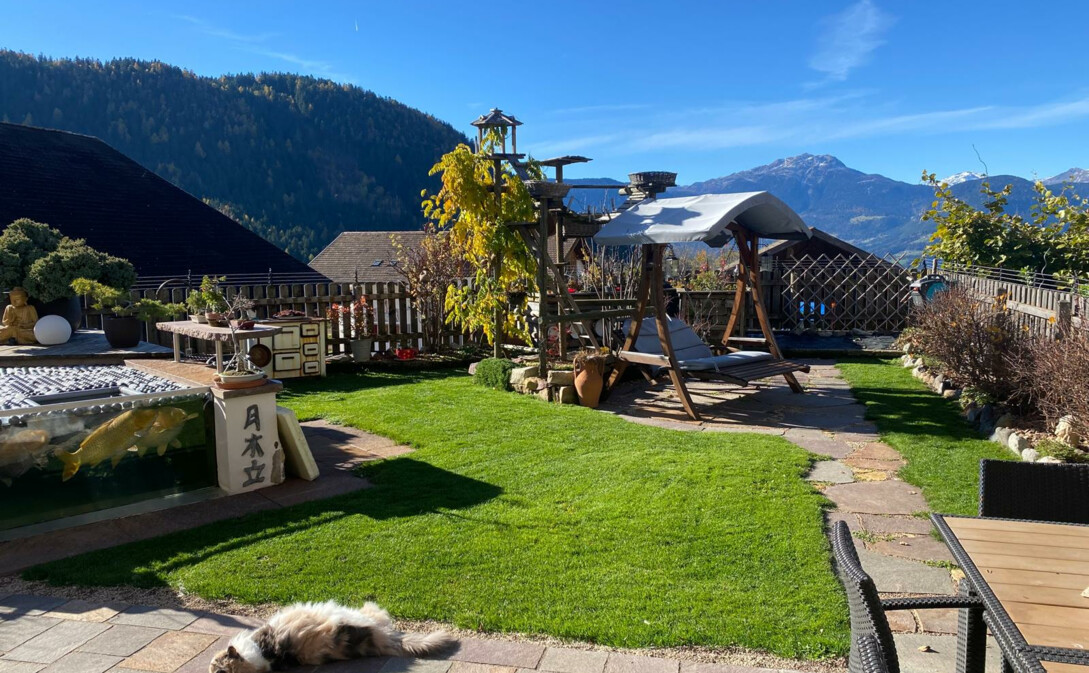 Punto di forza è senza dubbio il grande giardino di circa 250 m², curato nei minimi dettagli, con un laghetto naturale balneabile e cinque koi giapponesi — un’oasi di relax e benessere perfetta per rinfrescarsi nelle giornate estive. La terrazza, esposta a sud-est, offre una magnifica vista panoramica sul Monte Lucco (Laugenspitze). L’esposizione garantisce sole per tutto l’anno e un’atmosfera di assoluta tranquillità.