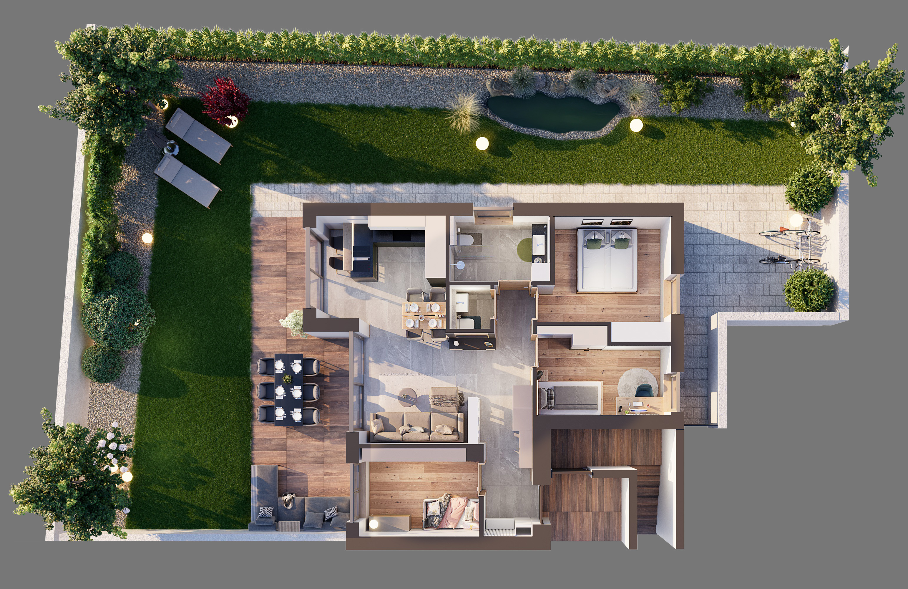 Divisione interna: ingresso, soggiorno con cucina, 3 camere da letto, bagno finestrato, bagno di servizio, terrazza e giardino privato. L’appartamento viene consegnato parzialmente arredato, comprensivo di cucina.