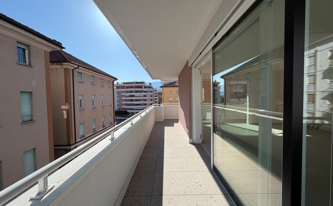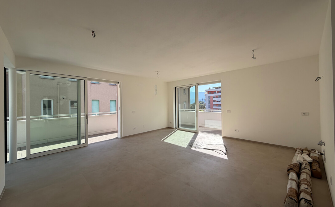 L'appartamento si trova al quarto piano ed è composto da un ingresso, soggiorno con cucina, 2 stanze da letto, 2 bagni e terrazza.